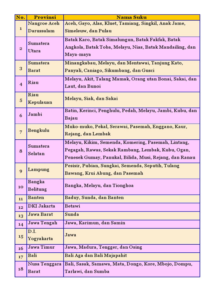 Indonesia memang merupakan negeri yang kaya. Teori pembentukan jagat raya bagi yang belum tahu berikut ini ada daftar suku daerah alias suku bangsa di 34 provinsi di indonesia. Hal ini sekaligus menjadikan jawa timur sebagai provinsi yang memiliki jumlah kabupaten kota terbanyak di indonesia. Provinsi nama suku 1 nangroe aceh darussalam aceh gayo alas kluet tamiang singkil anak jame simeleuw dan pulau 2 sumatera utara batak karo batak simalungun batak fakfak batak angkola.